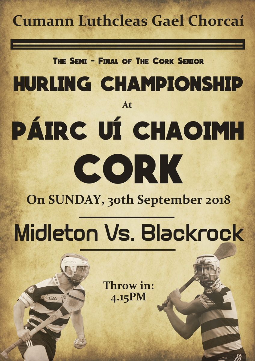 Sunday 30th County Senior Hurling semi final v Blackrock in P Ui Chaoimh @ 4.15pm