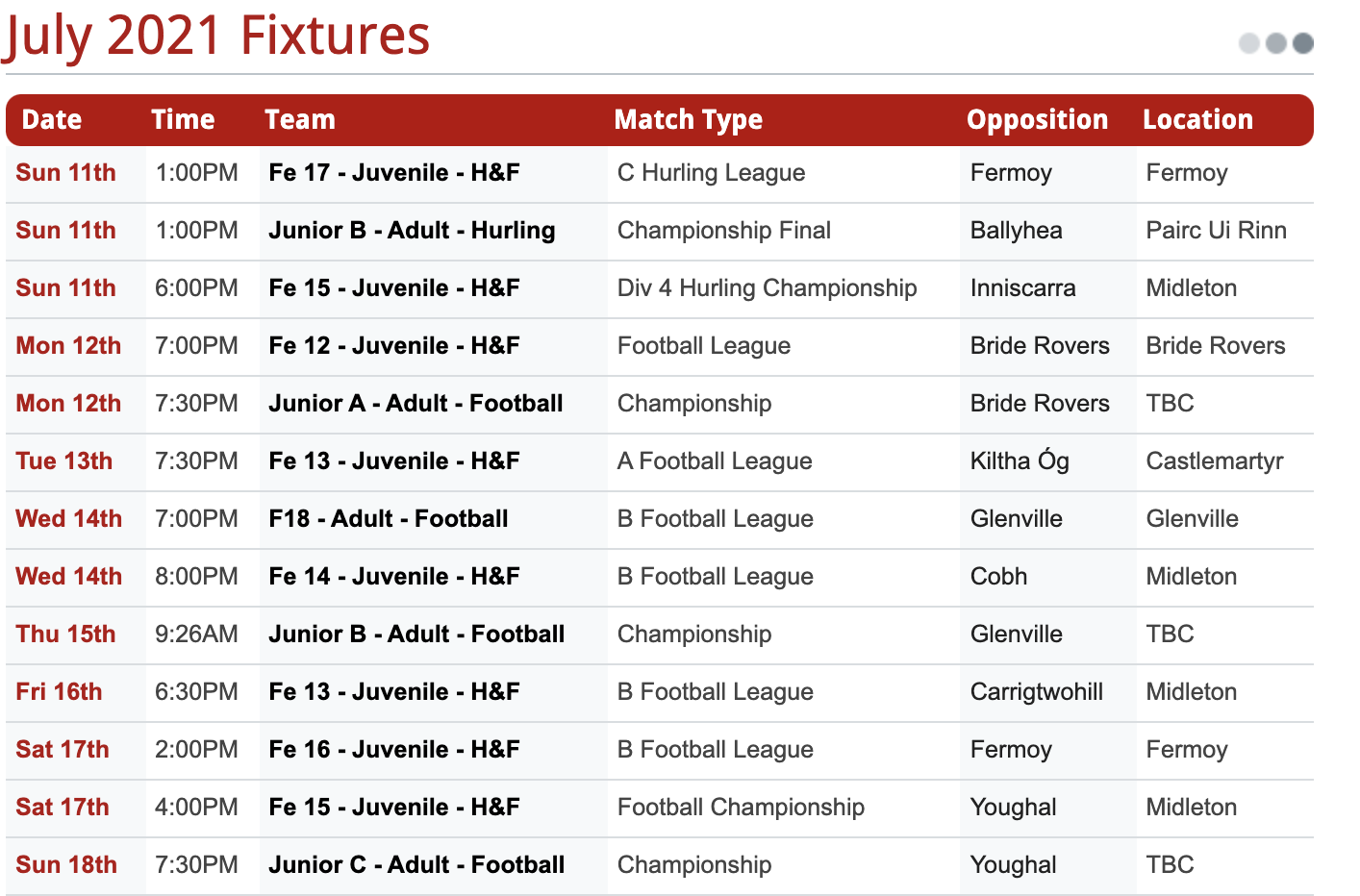 Fixtures are coming ‘hot and heavy’ across all sections of the club, at both adult and juvenile sections. We will endeavor to keep the club website up to date with fixtures and results as well as posting results, as much as possible, on twitter and facebook. Team managers are asked to submit results and any fixture changes to pro.midleton.cork@gaa.ie or text 0868643079.