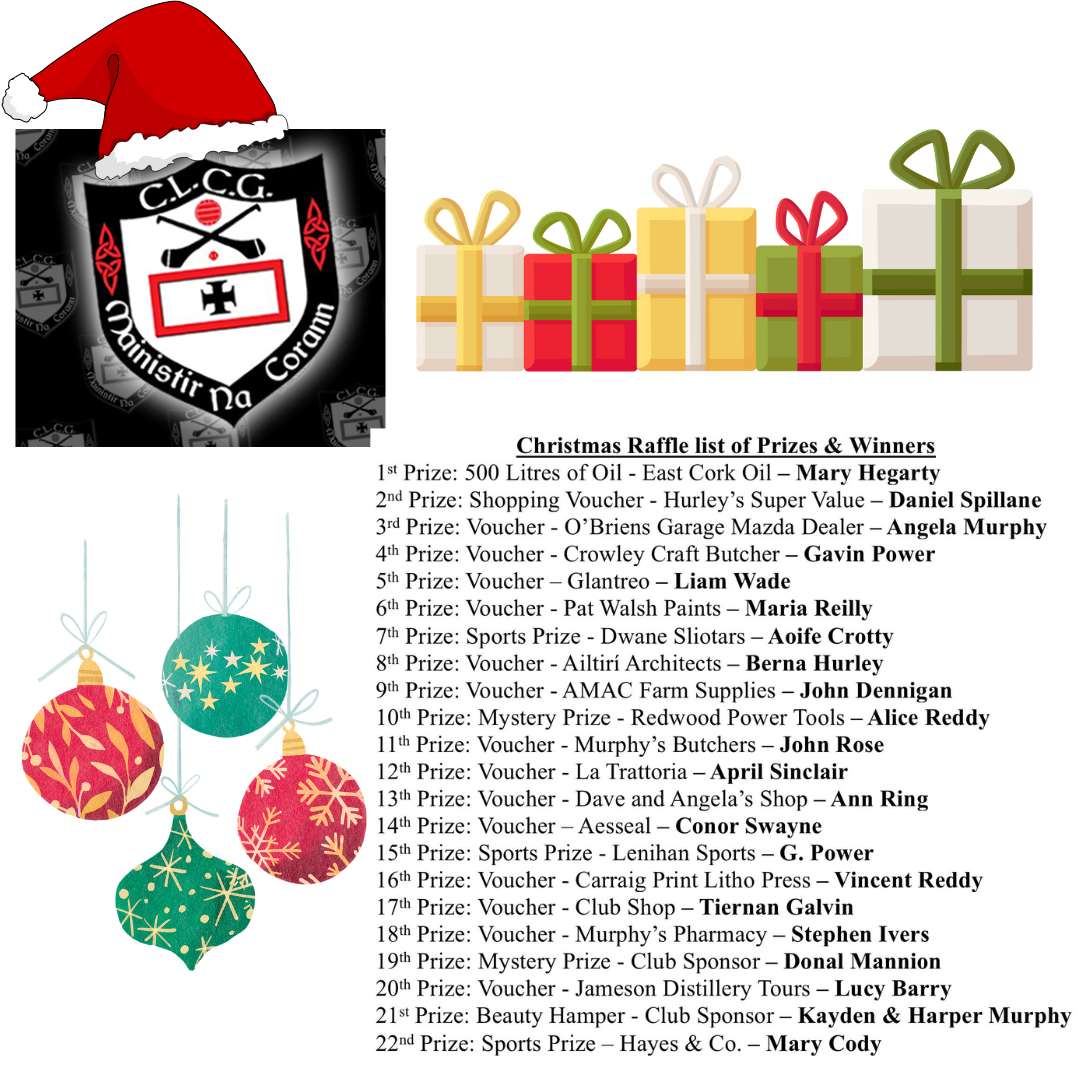 Our Christmas Raffle took place on Friday night last. A big thank you to everyone who sold and bought tickets and everyone who sponsored a prize...your support is much appreciated. Here are the winners....