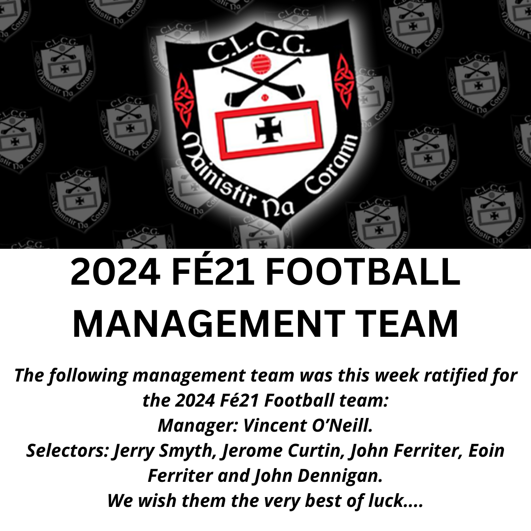 This is our Fé21 Football Management team for 2024. Thanks to all for putting themselves forward and the very best of luck to them and their players. This championship is due to begin in early February this year.