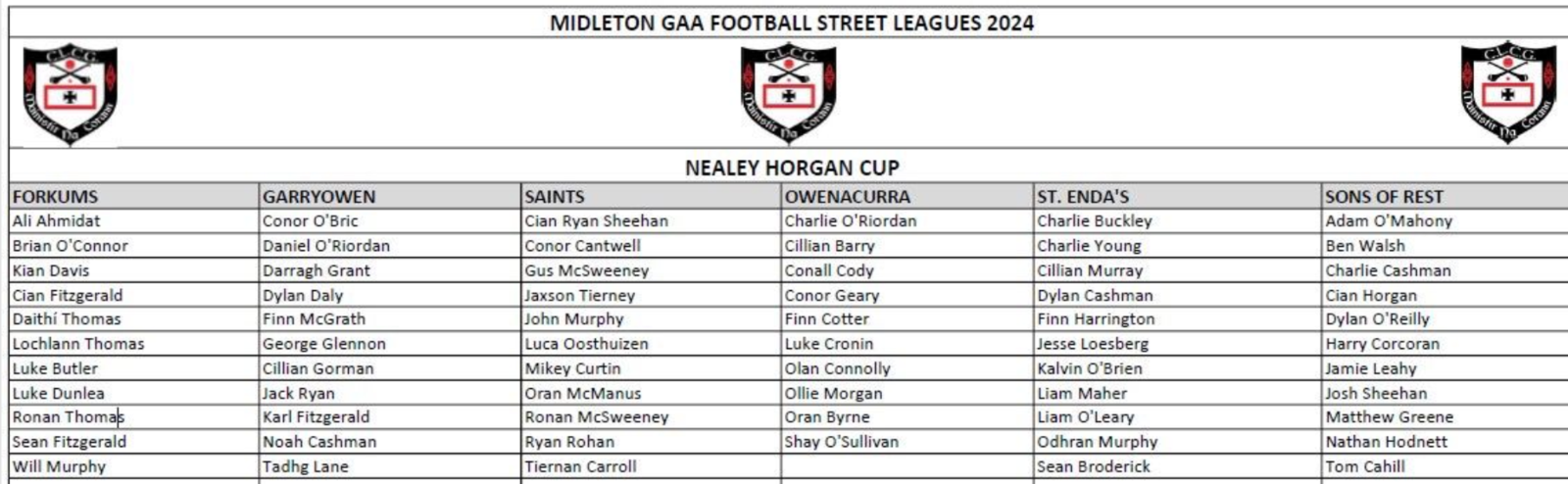 Our 2024 Nealey Horgan Football Street Leagues got underway in balmy conditions in Park South on Monday night and continue next Monday. Well done to all the boys oa reat night of football on Monday and best of luck for the rest of the competition. These are the teams....