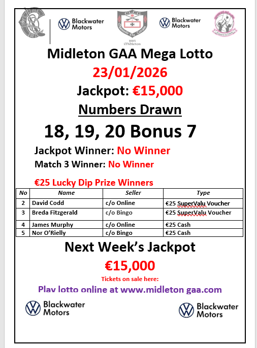 Support our Club and purchase a Rebels Bounty ticket for 2026. There are cash prizes each month. Midleton GAA tickets holders are also entered into an inhouse draw as our way of saying thank you for supporting our Club. To purchase a Rebels Bounty ticket please click on the following link:https://rebelsbounty.ergogroup.ie/prod/rebelsbounty/join-draw