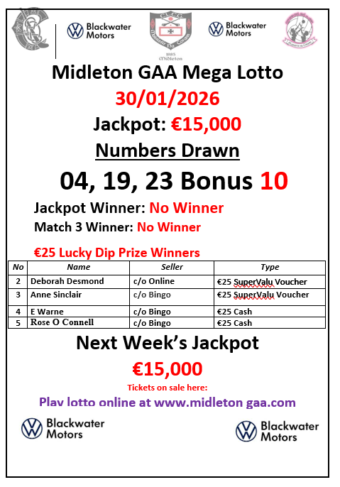 Support our Club and purchase a Rebels Bounty ticket for 2026. This is a very important Fundraiser for our Club but we need your suport. There are cash prizes each month. Midleton GAA tickets holders are also entered into an inhouse draw as our way of saying thank you for supporting your Club. To purchase a Rebels Bounty ticket please click on the following link:https://rebelsbounty.ergogroup.ie/prod/rebelsbounty/join-draw
