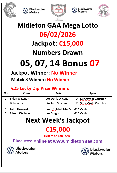 Support your Club and purchase a Rebels Bounty ticket for 2026. This is a very important Fundraiser for our Club but we need your suport. There are cash prizes each month. Midleton GAA tickets holders are also entered into an inhouse draw as our way of saying thank you for supporting your Club. To purchase a Rebels Bounty ticket please click on the following link:https://rebelsbounty.ergogroup.ie/prod/rebelsbounty/join-draw