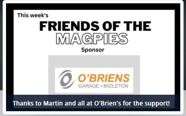Our current Featured Friend of the Magpies is O'Briens Garage Midleton. Many thanks to them for their continued support.